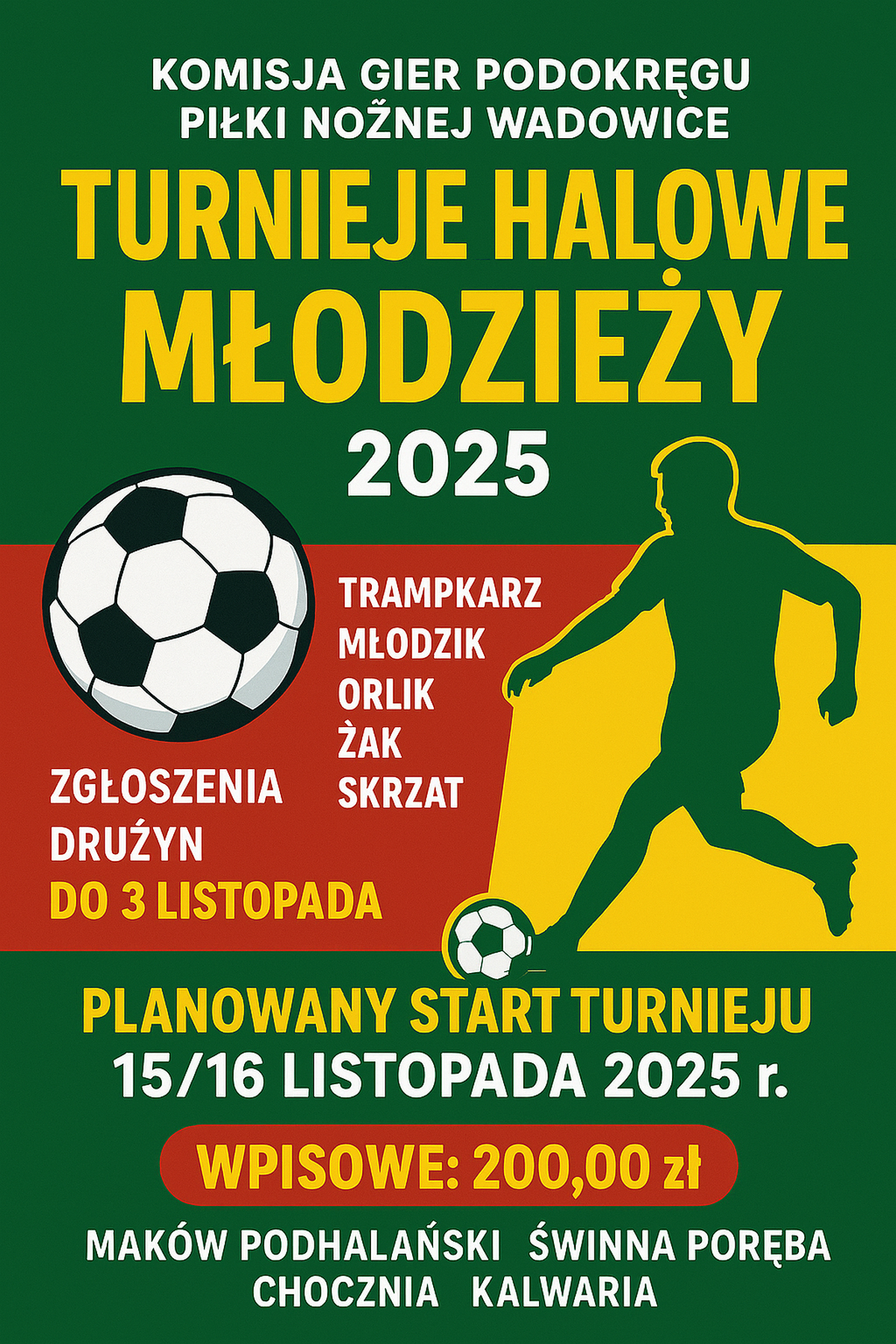 ⚽ Turnieje Halowe Młodzieży – Organizator Podokręg Piłki Nożnej Wadowice 2025 – tylko drużyny z terenu Podokręgu Wadowice.